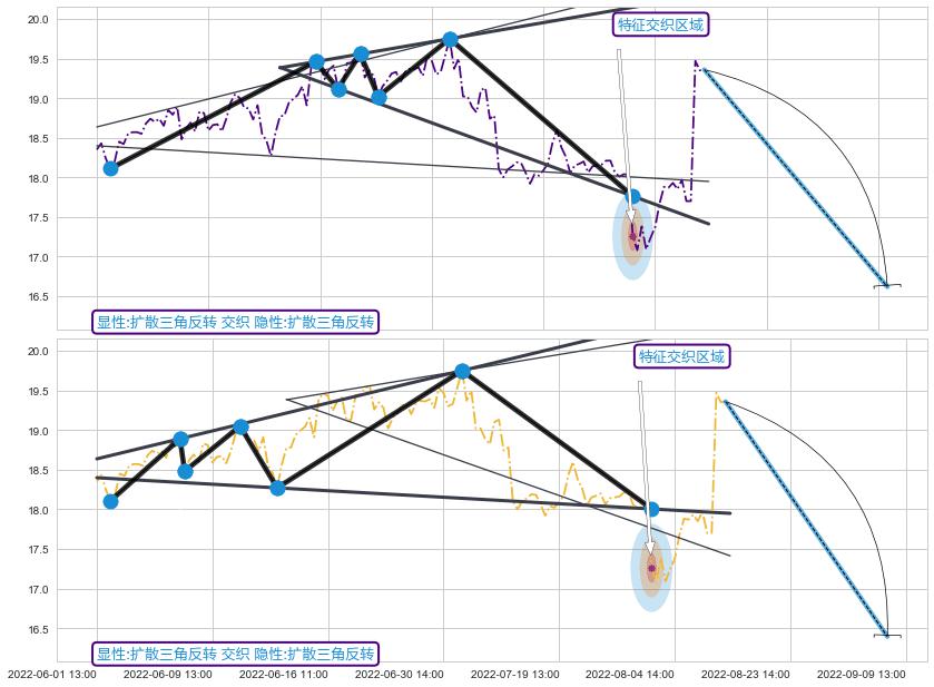 ➣ 扩散三角反转:下行突破支撑位破位, 猜想持续下沉下跌,被突破的支撑位已变为阻力位