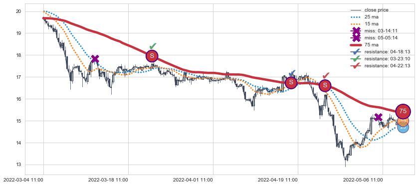 ➢ 75小时均线于(07-13 14:00: 16.65)形成【金叉】基于【金叉历史模型】预测金叉后最高波峰价格: 17.76, 金叉后最高价格23.24,已经上涨超出预测最高波峰价格, 预期回调