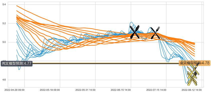 ➣ 40小时均线于(06-16 14:00: 5.11)形成【死叉】基于【死叉历史模型】预测死叉后最低波谷价格: 4.81, 死叉后最低价格4.53,已经下跌超出预测最低波谷价格, 预期反弹