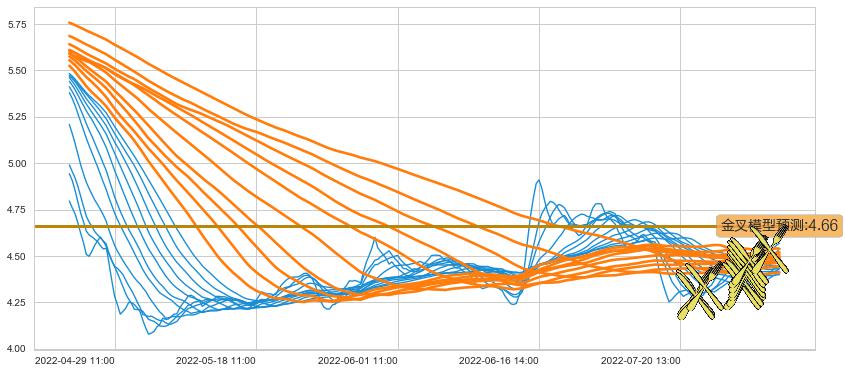 ➢ 10小时均线于(07-22 14:00: 4.30)形成【金叉】基于【金叉历史模型】预测金叉后最高波峰价格: 4.37, 金叉后最高价格4.64,已经上涨超出预测最高波峰价格, 预期回调