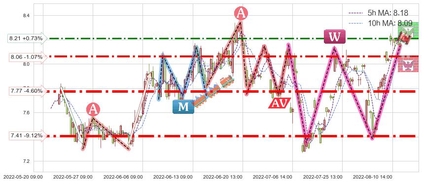 ♘ 阻力价格位8.21,可信任强度63.53%,距离最后交易2022-08-12 14:00形成的收盘价格8.15相差 +0.73%