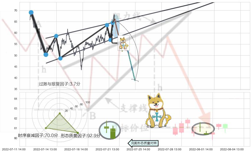 ➢ 下跌螺旋桨 🔜 升楔型临近支撑猜想转换阻力下跌 综合量化分数:47.00 【中性】