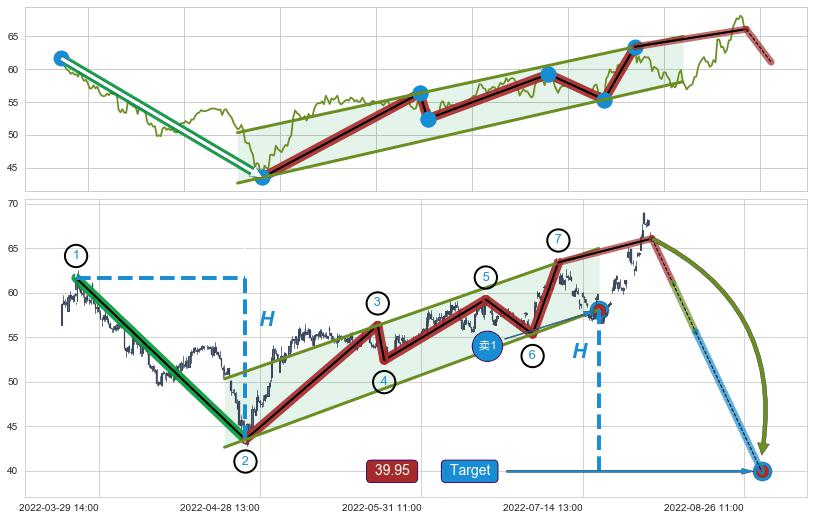 ➣ 升旗形:猜想临近关键支撑位突破点 → 临近拐点下跌 → 风险信号 → 大趋势均值回复