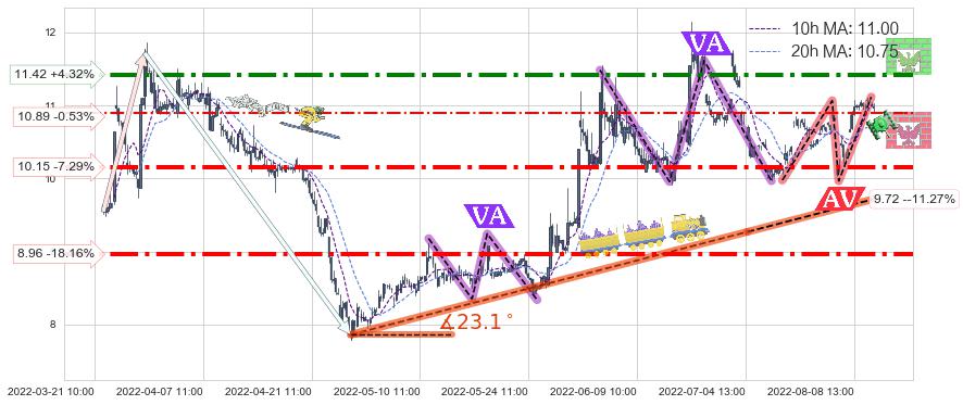 ♘ 支撑价格位10.89,可信任强度47.79%,距离最后交易2022-08-12 14:00形成的收盘价格10.95相差 -0.53%