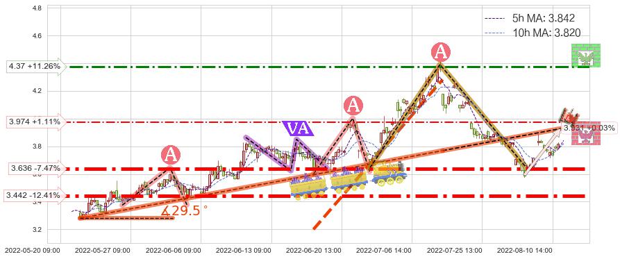 ♘ 支撑价格位3.974,可信任强度47.68%,距离最后交易2022-08-12 14:00形成的收盘价格3.930相差 +1.11%