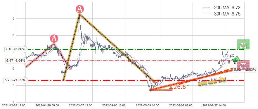 ♞ 20小时均线:6.72,30小时均线:6.75→ 快线<慢线