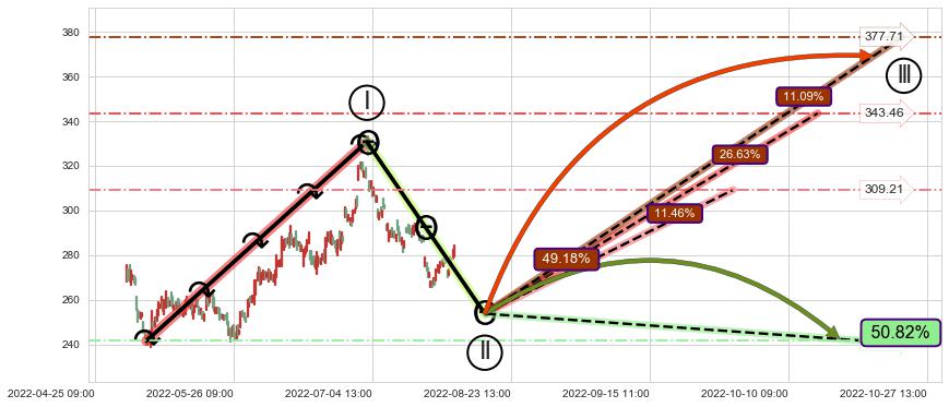 ➢ 循环浪继续向上【最高】位置(10-27:13, 377.71),匹配聚类样本比例22.55%, 可能性概率11.09%