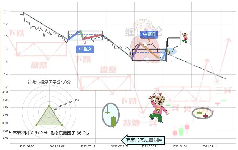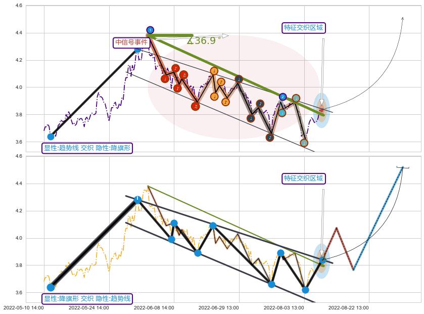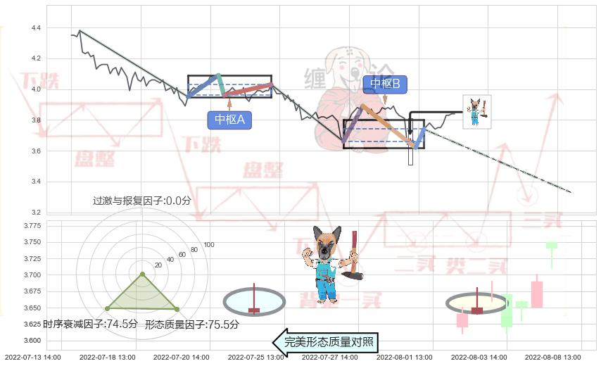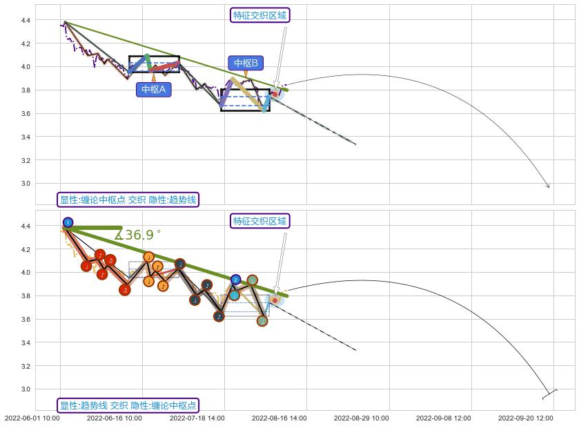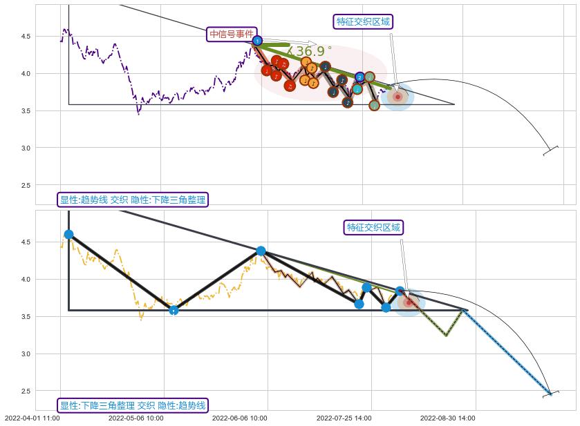 从2022-06-01 14:00至2022-08-11 14:00,共包含134个小时,阶段股价下跌-12.72%,阶段股价变动位移路程比: 1 : 7,下跌趋势角度: 36.9,2022-08-02 13:00向↘︎形成缺口,跳空下跌-4.46%˚