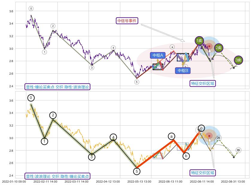 ➣ 缠论买卖点:猜想2卖持续蓄力下跌至3卖 → 下跌 → 风险信号 → 小趋势跟踪