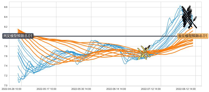 ➢ 10小时均线于(08-08 14:00: 8.43)形成【死叉】基于【死叉历史模型】预测死叉后最低波谷价格: 8.28, 死叉后最低价格8.21,已经下跌超出预测最低波谷价格, 预期反弹