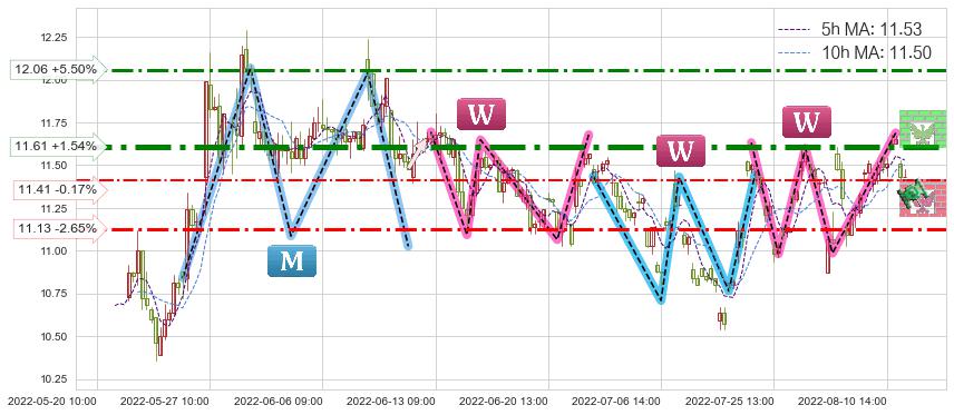 ♘ 阻力价格位11.61,可信任强度92.19%,距离最后交易2022-08-12 14:00形成的收盘价格11.43相差 +1.54%