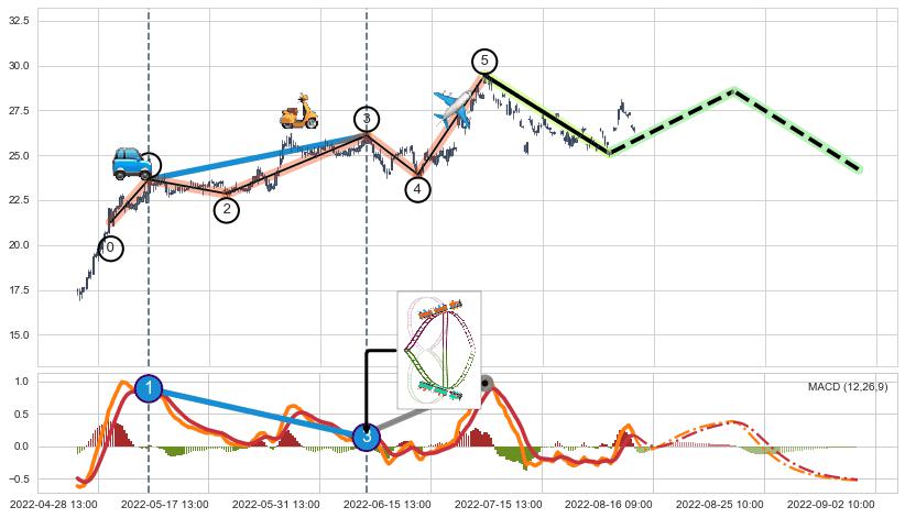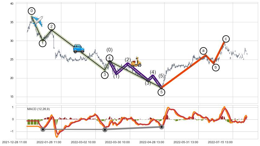 ➣ 波浪理论:猜想达到c点后小反弹终止反转下跌 → 下跌 → 【拐点】临近 → 阶段均值回复结束后继续大周期趋势跟踪
