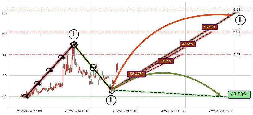 ➣ 2022-04-27 09:00-2022-06-17 09:00上升趋势存在反转[风险],虽然原上升趋势的支撑位(5.28)已破位,但其支撑效果尚存,原上升趋势角度: 35.2˚