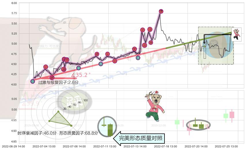从2022-04-27 09:00至2022-06-17 09:00,共包含168个小时,阶段股价上涨23.25%,阶段股价变动位移路程比: 1 : 6,上涨趋势角度: 35.2