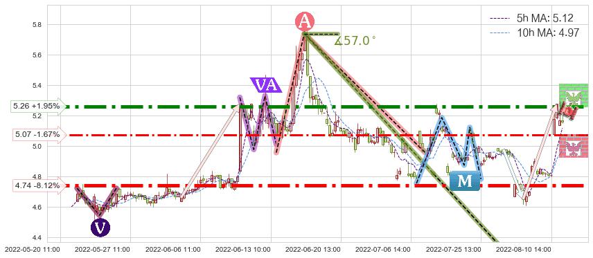 ♘ 阻力价格位5.26,可信任强度88.04%,距离最后交易2022-08-12 14:00形成的收盘价格5.16相差 +1.95%