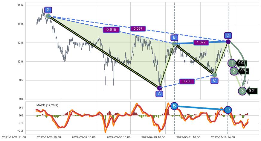 ➢ 谐波价格D点比B点高 ⤴,【MACD】指标D点比B点低 ⤵️