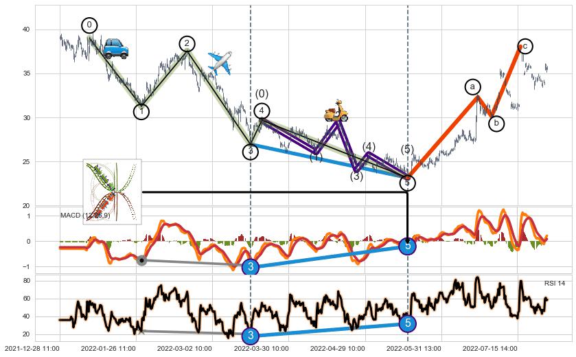 ➣ 波浪理论:猜想达到c点后小反弹终止反转下跌 → 下跌 → 【拐点】临近 → 阶段均值回复结束后继续大周期趋势跟踪