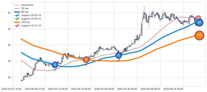 05-09 15:00至06-14 10:00 慢线与快线呈多头排列, 慢线与快线接触少,无缠绕