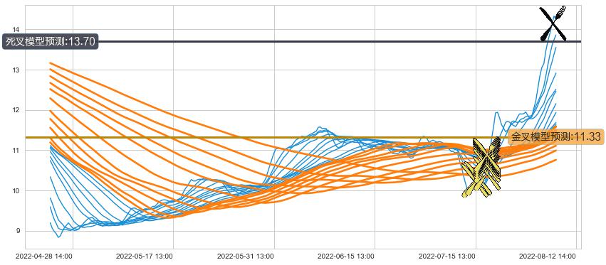 ➢ 5小时均线于(08-11 14:00: 14.13)形成【死叉】基于【死叉历史模型】预测死叉后最低波谷价格: 13.70, 死叉后最低价格14.09,尚未达到预测最低波谷价格, 预期继续下跌