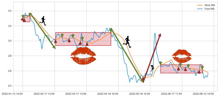 01-20 10:00至02-18 10:00 慢线与快线呈空头排列, 慢线与快线接触少,无缠绕