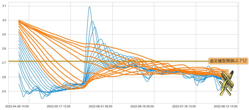 ➢ 40小时均线于(08-11 14:00: 2.572)形成【金叉】基于【金叉历史模型】预测金叉后最高波峰价格: 2.688, 金叉后最高价格2.590,尚未达到预测最高波峰价格, 预期继续上涨