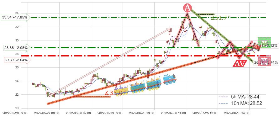 ♘ 阻力价格位28.88,可信任强度76.51%,距离最后交易2022-08-12 14:00形成的收盘价格28.29相差 +2.08%