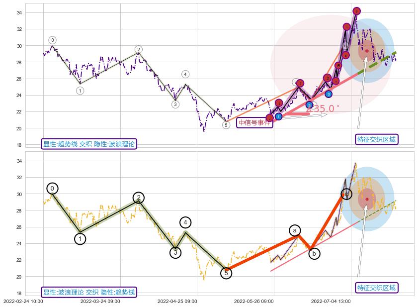 从2022-05-25 10:00至2022-07-08 14:00,共包含114个小时,阶段股价上涨40.53%,阶段股价变动位移路程比: 1 : 3,上涨趋势角度: 35.0