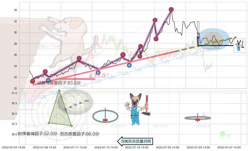 ➢ 2022-05-25 10:00-2022-07-08 14:00上升趋势存在反转[风险],虽然原上升趋势的支撑位(29.17)已破位,但其支撑效果尚存,原上升趋势角度: 35.0˚