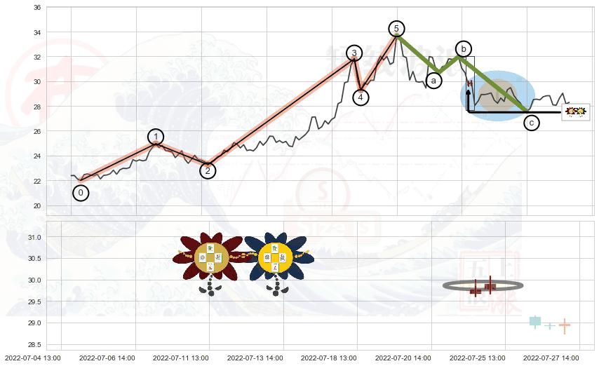 ➣ 2022-05-25 10:00-2022-07-08 14:00上升趋势存在反转[风险],虽然原上升趋势的支撑位(29.17)已破位,但其支撑效果尚存,原上升趋势角度: 35.0˚