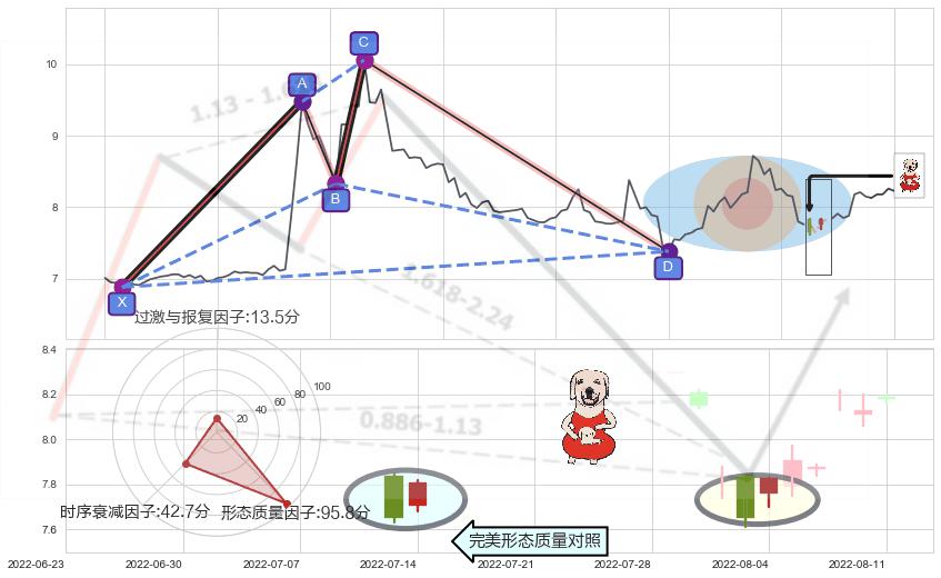 ➣ 上涨螺旋桨形态 + 谐波鲨鱼d拐点上涨支撑信号叠加后【目标达成率】中等,【看多】信号叠加【存续影响中等】