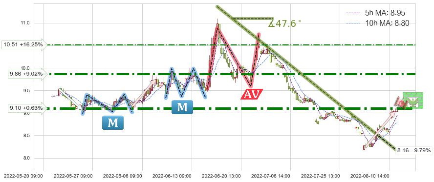 ♘ 阻力价格位9.86,可信任强度76.92%,距离最后交易2022-08-12 14:00形成的收盘价格9.04相差 +9.02%