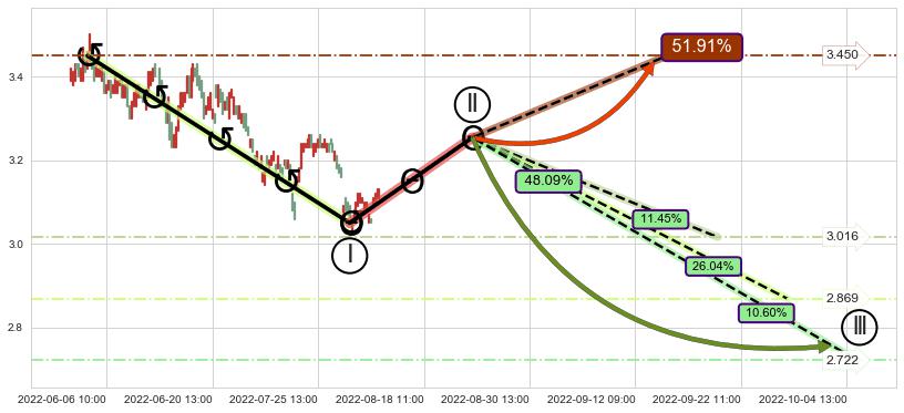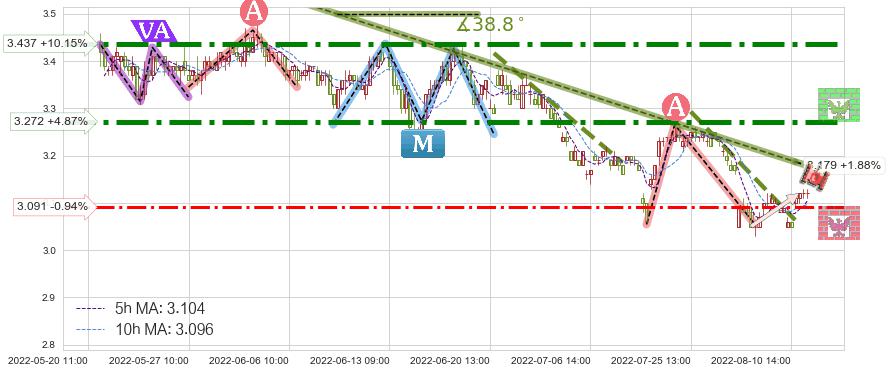 ♘ 阻力价格位3.437,可信任强度97.24%,距离最后交易2022-08-12 14:00形成的收盘价格3.120相差 +10.15%