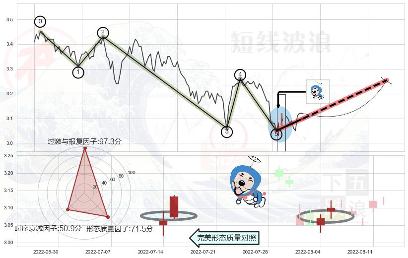 从2022-08-03 14:00至2022-08-12 14:00,共包含15个小时,阶段股价上涨2.30%,阶段股价变动位移路程比: 1 : 2
