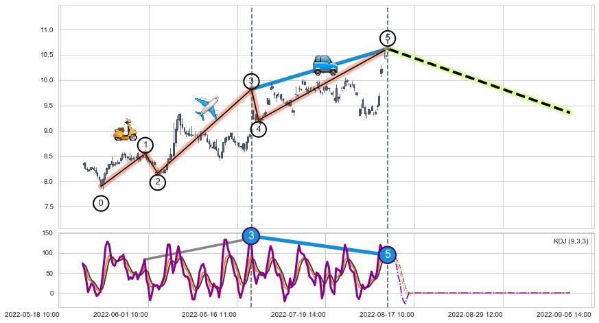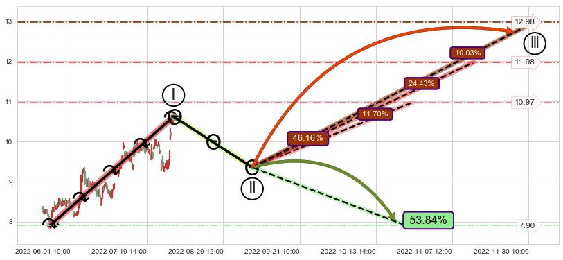 从2022-06-02 10:00至2022-06-20 13:00,共包含54个小时,阶段股价上涨19.34%,阶段股价变动位移路程比: 1 : 2