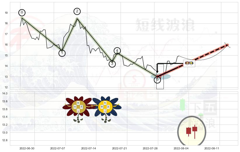 从2022-08-04 13:00至2022-08-12 14:00,共包含14个小时,阶段股价上涨14.41%,阶段股价变动位移路程比: 1 : 1.5