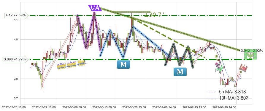 ♘ 阻力价格位3.898,可信任强度84.42%,距离最后交易2022-08-12 14:00形成的收盘价格3.830相差 +1.77%