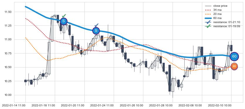 ➢ 最优均线组合共正确确认支撑阻力信号14处,正确确认率 77.78%