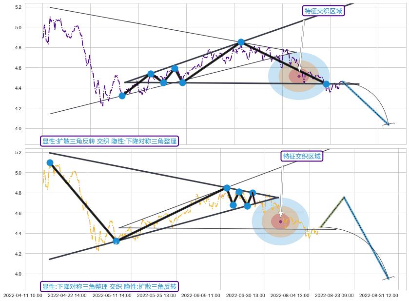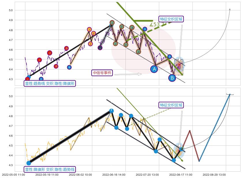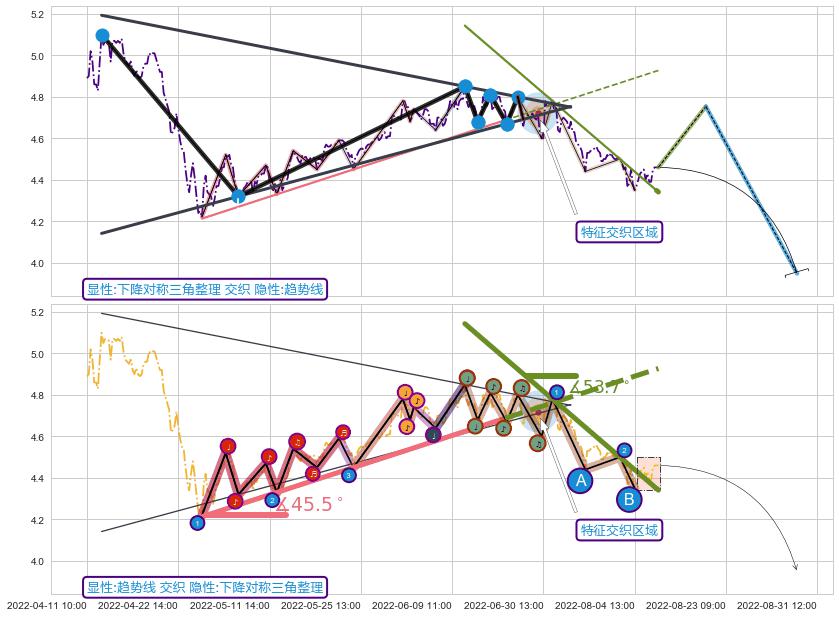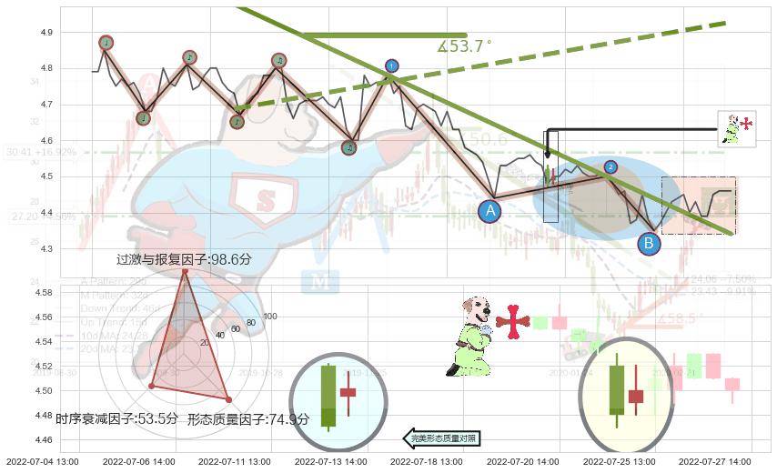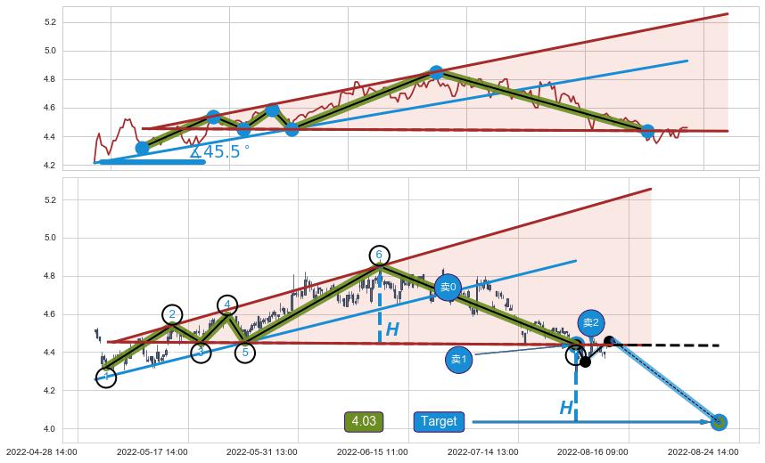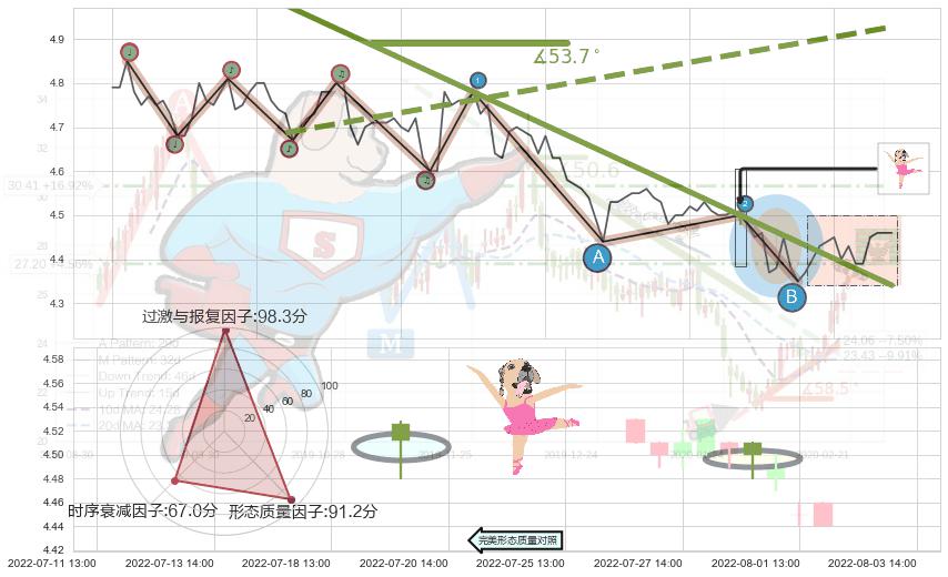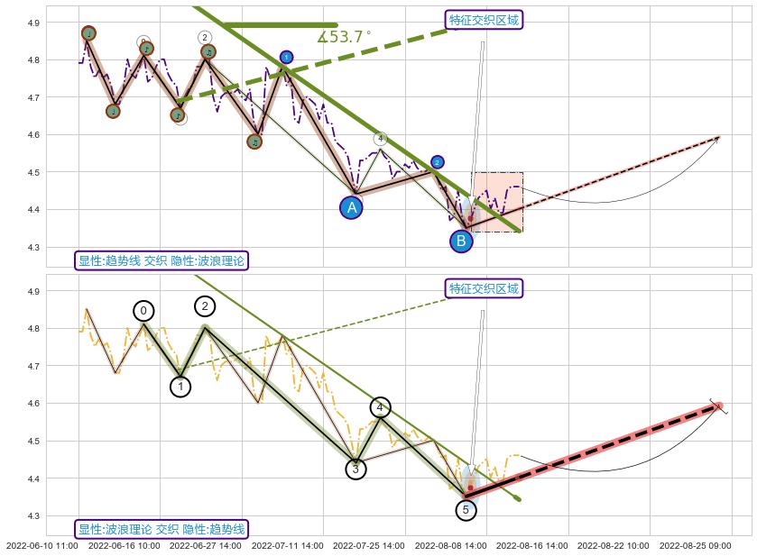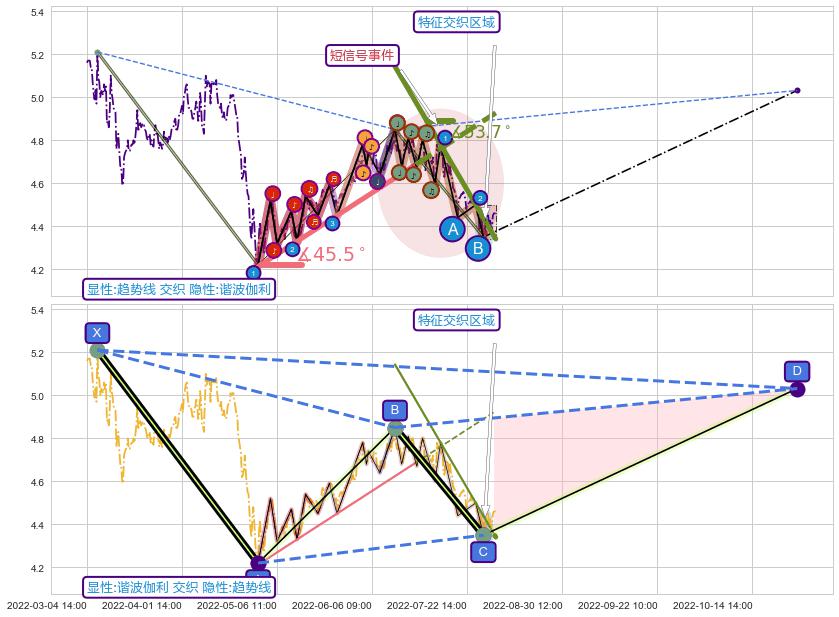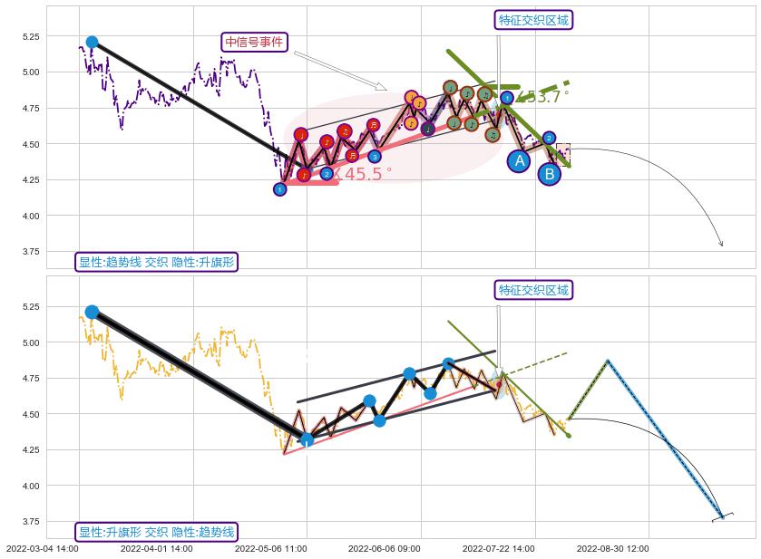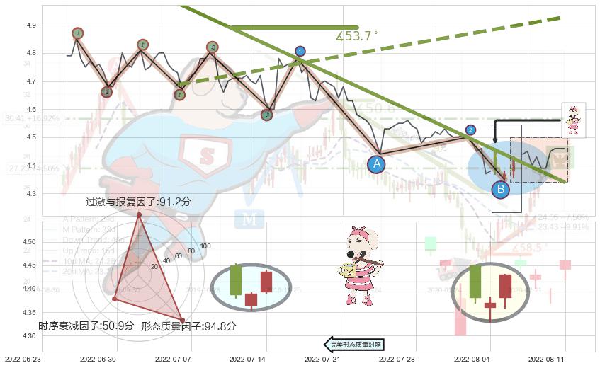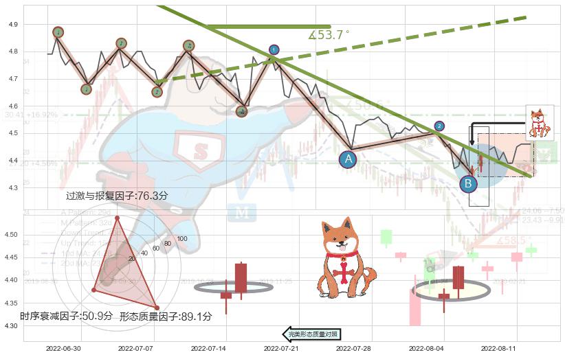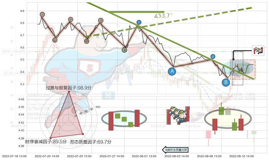 ➢ 2022-06-10 14:00-2022-08-12 13:00下跌趋势存在反转上涨[机会],其原下跌趋势的阻力位(4.34)已被突破[强支撑信号],原下跌趋势角度: 53.7˚