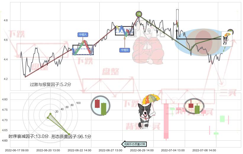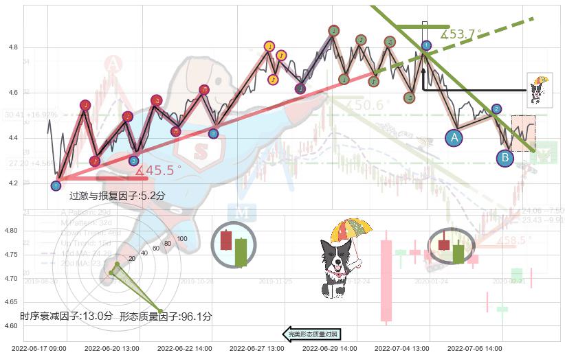 ➢ 2022-04-27 11:00-2022-06-17 09:00上升趋势存在反转[风险],其原上升趋势的支撑位(4.93)已破位[强阻力信号],原上升趋势角度: 45.5˚