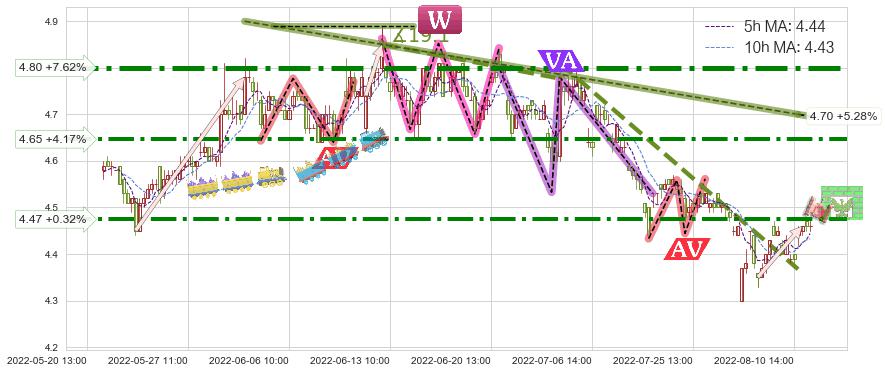 ♘ 阻力价格位4.47,可信任强度81.69%,距离最后交易2022-08-12 14:00形成的收盘价格4.46相差 +0.32%