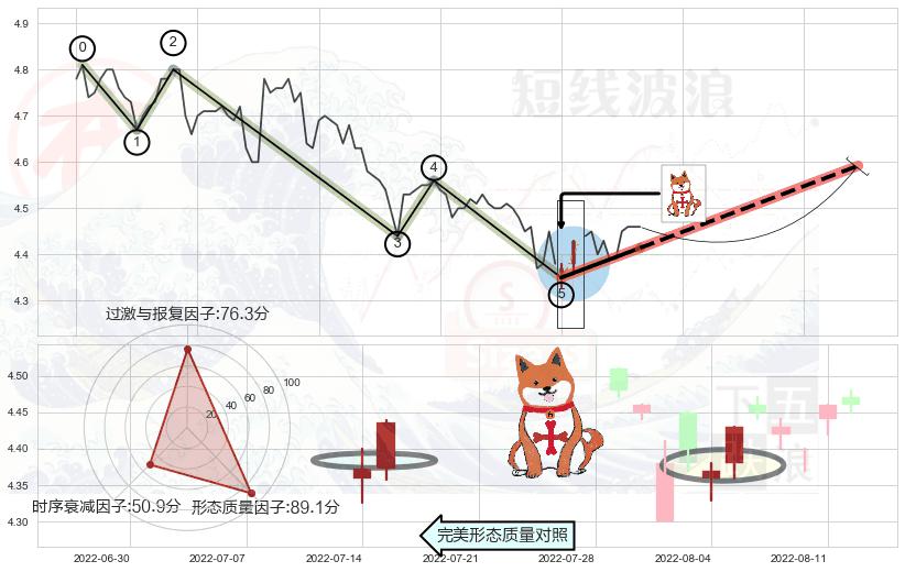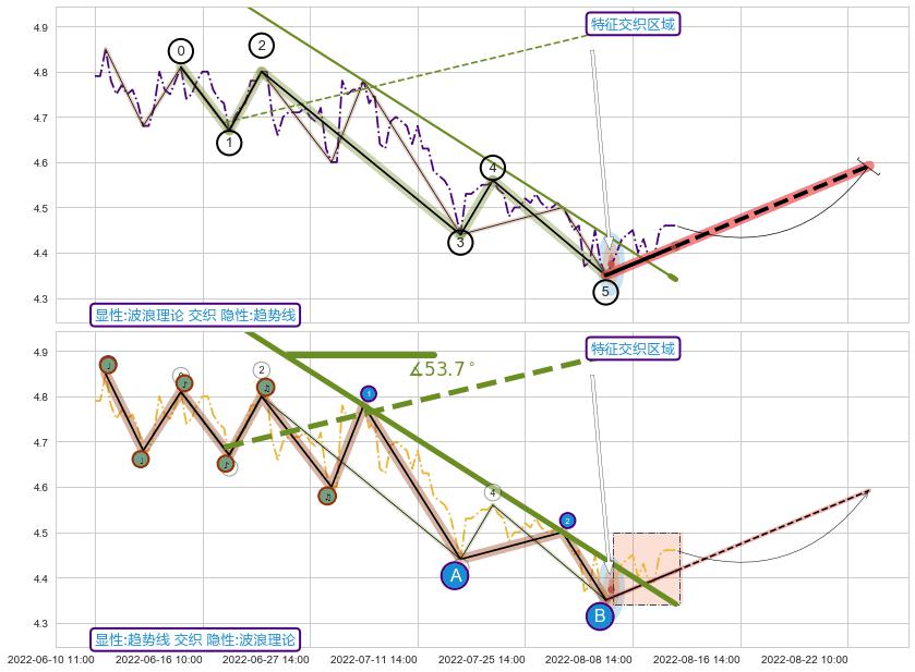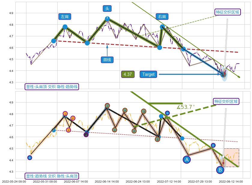 ➢ 2022-06-10 14:00-2022-08-12 13:00下跌趋势存在反转上涨[机会],其原下跌趋势的阻力位(4.34)已被突破[强支撑信号],原下跌趋势角度: 53.7˚