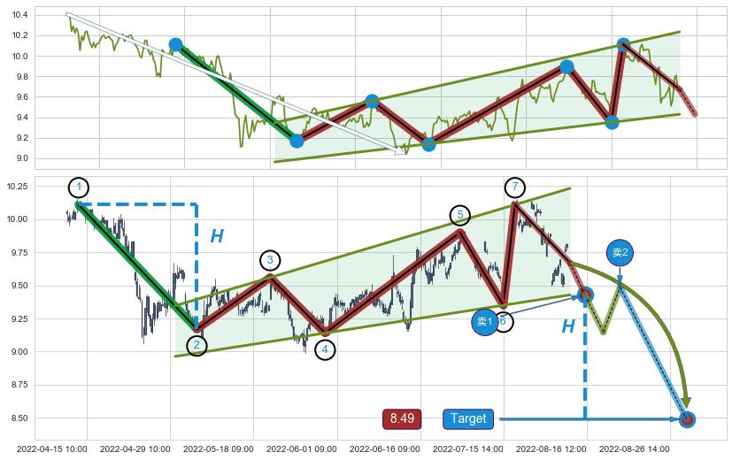 ➣ 收盘价(08-08:14: 9.62 )→回踩→第二根k线高点(08-05:13: 9.54 )