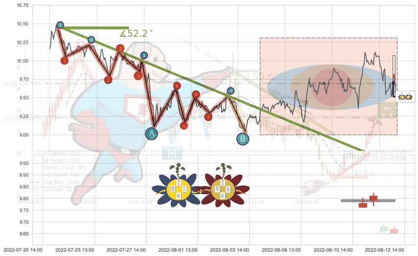 ➢ 2022-03-24 11:00-2022-06-15 11:00下跌趋势存在反转上涨[机会],其原下跌趋势的阻力位(8.59)已被突破[强支撑信号],原下跌趋势角度: 52.2˚