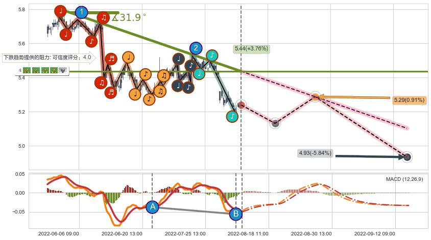 ➢ 预测:2022-09-13 14:00,【继续下探】稳定目前下跌趋势的前提下,预测价格:4.93