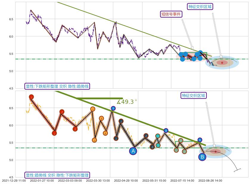 ♘ 在最后的下跌阶段2022-05-31 09:00至2022-08-12 13:00,存在 持续未破位的阻力位 ,阻力价格5.44,可信任强度84.55%,其距离最后价格5.24相差 +3.76%