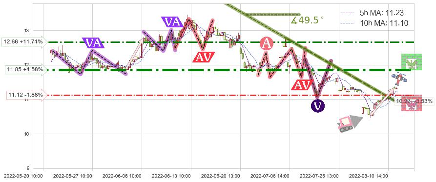 ➣ 2022-06-10 14:00-2022-08-11 14:00下跌趋势存在反转上涨[机会],其原下跌趋势的阻力位(10.93)已被突破[强支撑信号],原下跌趋势角度: 49.5˚