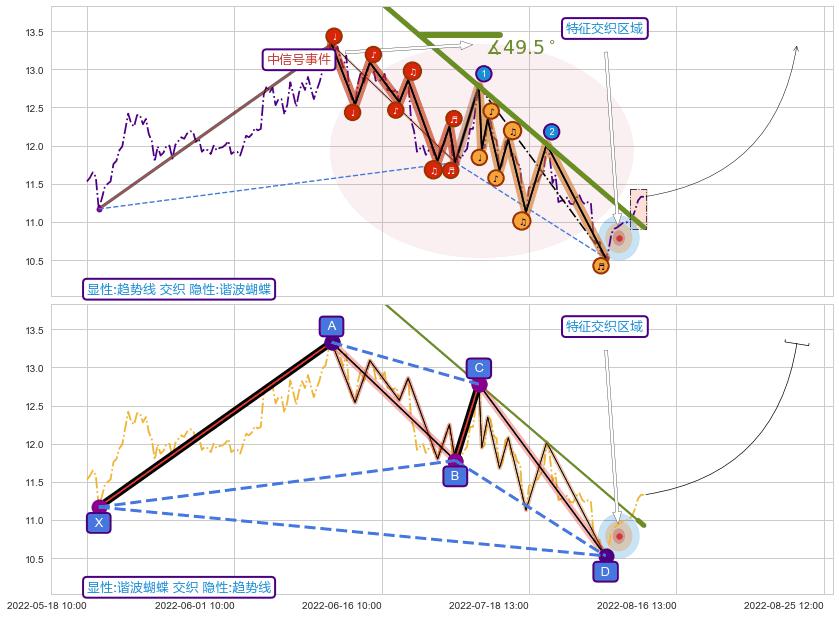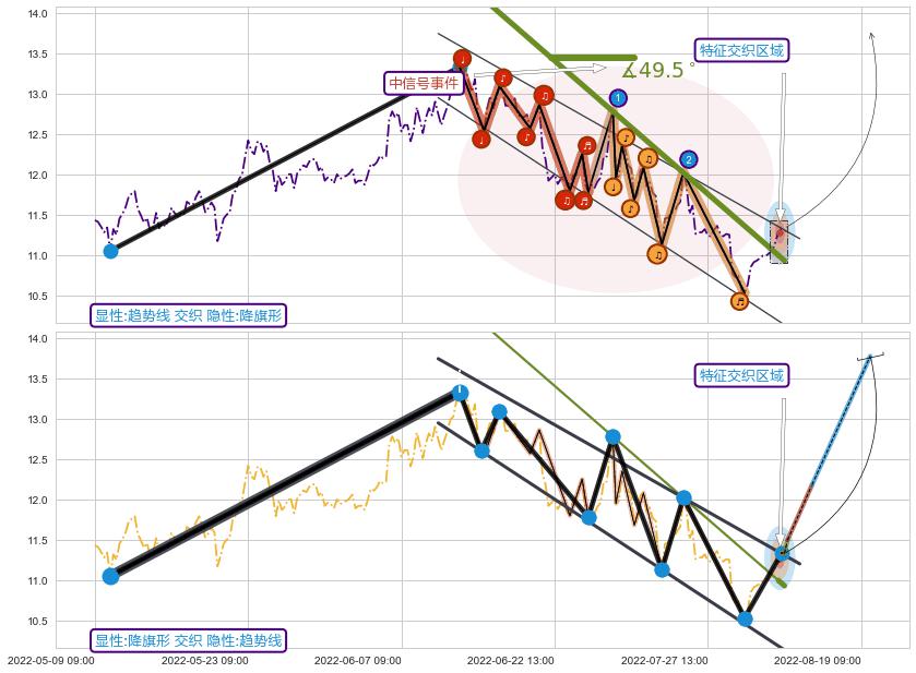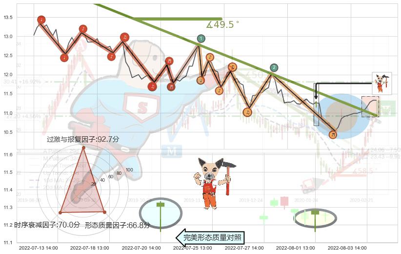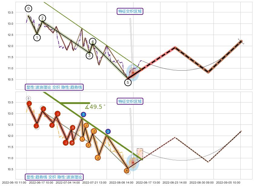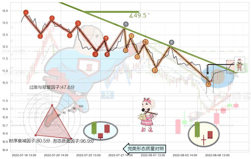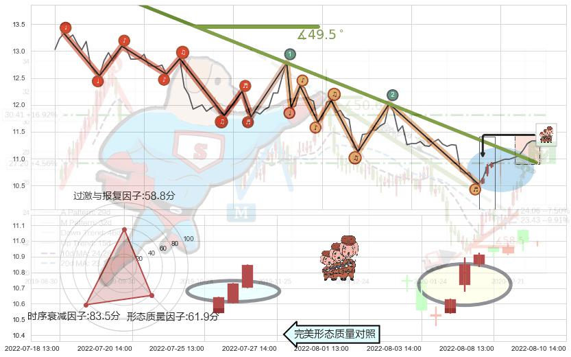 ➢ 2022-06-10 14:00-2022-08-11 14:00下跌趋势存在反转上涨[机会],其原下跌趋势的阻力位(10.93)已被突破[强支撑信号],原下跌趋势角度: 49.5˚