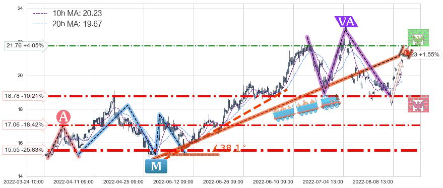 ➣ 2022-04-26 14:00-2022-07-15 13:00上升趋势存在反转[风险],虽然原上升趋势的支撑位(21.23)已破位,但其支撑效果尚存,原上升趋势角度: 38.1˚