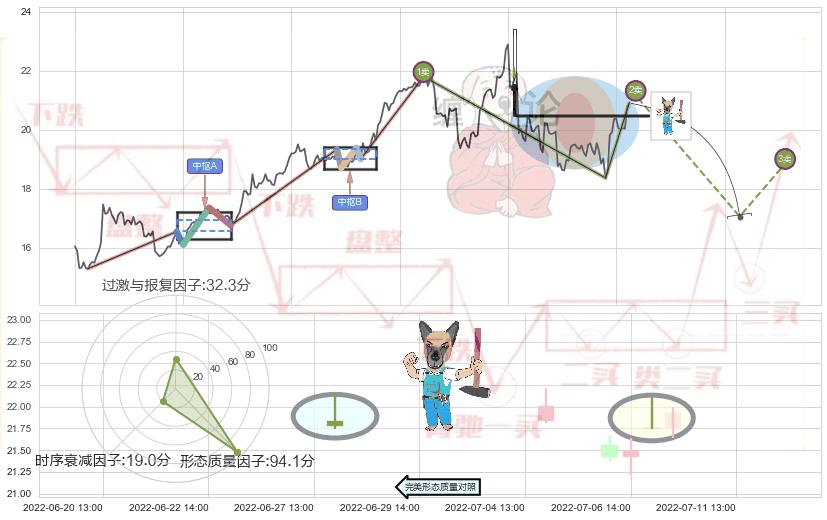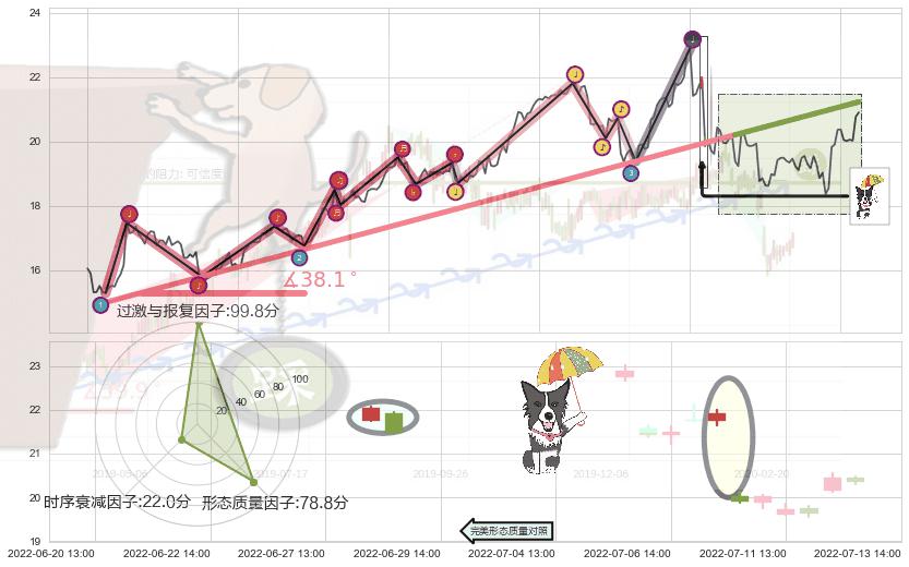 ➢ 2022-04-26 14:00-2022-07-15 13:00上升趋势存在反转[风险],虽然原上升趋势的支撑位(21.23)已破位,但其支撑效果尚存,原上升趋势角度: 38.1˚