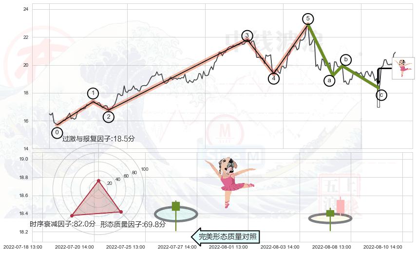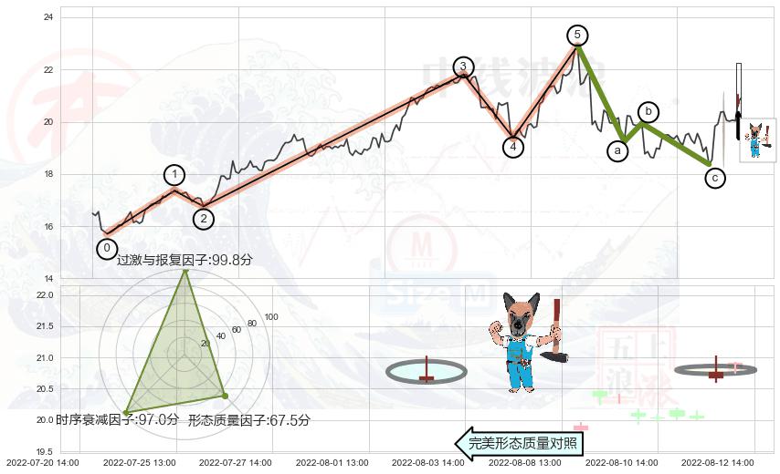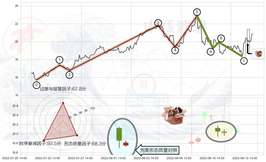 从2022-07-22 14:00至2022-08-12 14:00,共包含31个小时,阶段股价上涨12.15%,阶段股价变动位移路程比: 1 : 3